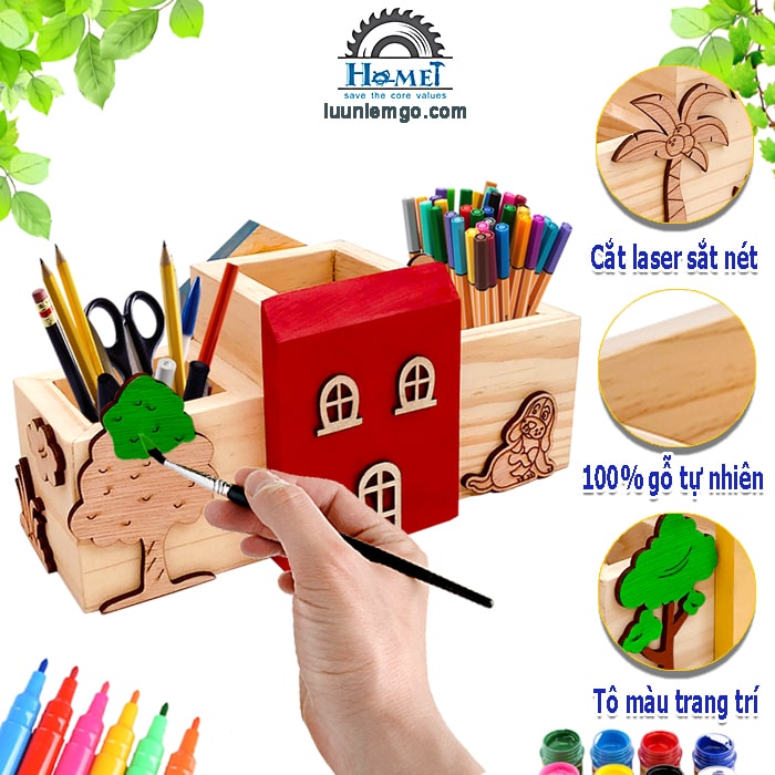 Hộp cắm bút để bàn bằng gỗ nhiều họa tiết, đa năng