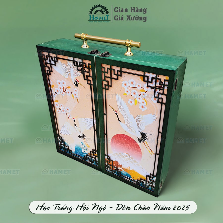 Hộp Quà Tết Mẫu Mới Nhất “Hạc Trắng Hội Ngộ“ Đựng Quà Tết Sang Trọng Có Khóa Gài Chắc Chắn, Thiết Kế 2 Cánh Mở