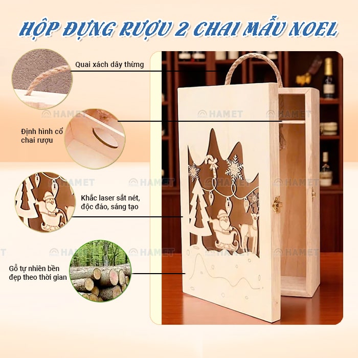 – Hộp rượu có quai sách tiện dụng, bên trong có khoen định hình cổ trai giúp bảo quản tốt rượu trong quá trình vận chuyển